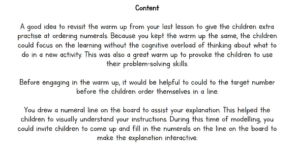 Upon reflection of my 6-week teaching block, my professional knowledge was something I needed to work on, and I did so by asking for feedback and then taking on that feedback to improve my practice. Referring to figures 1.4 & 1.5, I needed to work on improving my checking for understanding to ensure I knew where my students were at within their learning to successfully prepare for the next lesson. I ensured that I took on this feedback and did closing questions with my students after each lesson to check for understanding. My note taking and observations enabled me to collect important data on my students that aided me within my professional knowledge. My ability to form positive connections with my colleagues and students enables me to foster a positive and academically rich learning environment that both myself and my reception students enjoyed being in. There is always room for improvement, and I will forever be open to growing and learning, that is a journey I am excited to continue. Overall, I am satisfied with my progress throughout my teaching block and believe I display effective professional knowledge within the education cohort.
