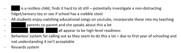 I ensured that I took notes throughout my 6-week teaching block of any observations, particularly in the beginning when getting to know my students, (see figure 1.3). My notes involved observations about students’ learning styles, behaviours, level of readiness, interests etc. It was essential that I took notes to enable effective professional knowledge within my classroom setting. I was able to freely look back at my notes whenever I needed, and they were completely confidential. It helped me to remember things I had noticed and things I wanted to implement within my 6-week teaching block. My notes also reminded me of things I needed to discuss with my colleagues that I may have otherwise forgotten.